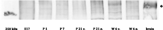 Cardiac and brain tissue was obtained from Wistar rats (five animals/age group) of either gender raised according to the guidelines for the care and use of laboratory animals by the US National Institute of Health. The local institutional Animal Care Committee (Georg August University, Göttingen) had approved all procedures. The animals were sacrificed by either decapitation (age 1 and 7 days) or cervical dislocation (age 21 days and 6 weeks) according to the local institutional animal care guidelines. Whole hearts and brains were taken out quickly and frozen in liquid nitrogen (Universal Industrial Gases, Easton, PA, USA) for RNA extraction and for Western blot analysis. At the developmental stages of 21 days and 6 weeks, atrial myocardium was separated from the ventricles before further processing. For preparation of embryonic tissue, pregnant rats were sacrificed by cervical dislocation on day 17 of gestation. Embryos were taken out of the uterus, and whole hearts and brains were quickly excised and frozen in liquid nitrogen for further procession.