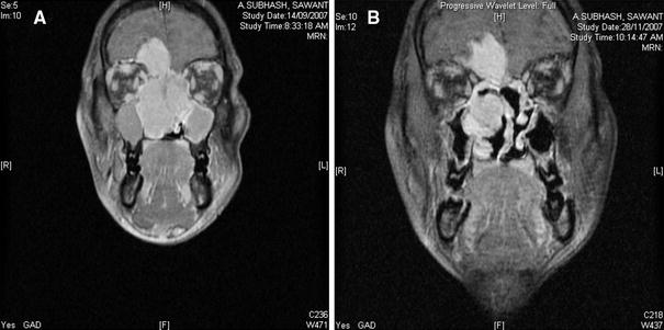 a A large enhancing mass in the nasoethmoidal region with erosion of cribriform plate and large intracranial extension in the anterior cranial fossa. (pre-chemotherapy MRI). b Decrease in the size of the mass as compared to the prechemotherapy MRI (Post-chemotherapy MRI)