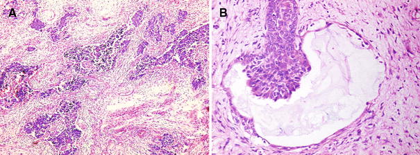 a Admixture of the primitive neuroectodermal & benign mesenchymal component, as seen in the biopsy (200× Hematoxylin & Eosin). b Epithelial component in the form of a dilated gland with transition into squamous epithelium surrounded by benign mesenchymal component (400× Hematoxylin & Eosin)