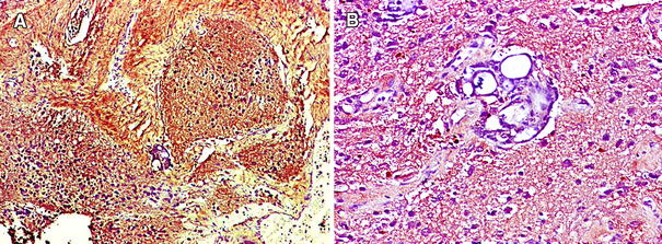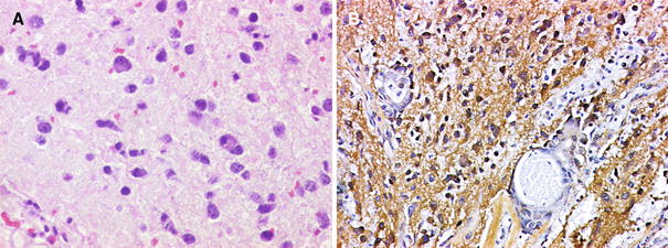 a NFP positivity in the nodules of immature neural tissue with neurofibrillary matrix. b Note the immuno-negativity in the mature epithelial component seen in the centre