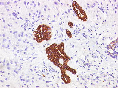 Patient underwent a craniofacial resection for a T3N0 sinonasal tumour following the neo-adjuvant chemotherapy. The specimen was received in multiple, partly hemorrhagic soft-to-rubbery tan-coloured tissue bits, having variegated appearance, the largest one measuring 2.5 × 2.0 × 1.0 cm. The entire tissue was submitted for processing. On microscopy, the tumour was heterogeneous and composed of intimate admixture of neuroectodermal, epithelial and mesenchymal components (Fig. 3). The neuroectodermal component was composed of immature ganglions cells embedded in abundant neurofibrillary matrix (Fig. 4). Although all the 16 hematoxylin and eosin-stained sections exhibited varying proportions of neurofibrillary matrix, it was predominant in the intracranial portion of the tumour. None of the sections showed primitive neuroectodermal cells as seen in the pre-chemotherapy biopsy. Embedded within the neurofibrillary matrix, numerous invasive epithelial islands composed of malignant squamous elements and characteristic hybrid squamo-glandular units were noted. A moderate atypia and mitotic activity were demonstrated in the epithelial elements. Mesenchymal component was composed of myofibroblastic proliferation with collagenized stroma. No obvious sarcomatous component was identified. Bone or cartilage was not seen. Surgical margins were positive for tumour. Scanty uninvolved brain paranchyma was also noted. Mature neuronal component was immunoreactive to neurofilament protein (NFP) [1:100; DAKO] (Fig. 5), NSE [1:100; Dako], synaptophysin [1:100; Dako], chromogranin [1:100; DAKO] and GFAP [1:1200; DAKO]. S-100 protein was focally positive. It was immunonegative for MIC2 [1:100; DAKO]. The glandular epithelial component was immunoreactive to epithelial membrane antigen [1:200; DAKO] and CK7 [1:100; DAKO] while the squamous component was positive for high molecular weight cytokeratin [1:100; DAKO] and p63 [1:200; DAKO] (Fig. 6). Positive labelling with vimentin and smooth muscle actin [1:400; DAKO] was observed in the mesenchymal component. There was no evidence of a germinoma, embryonal carcinoma, yolk-sac tumour or choriocarcinoma in any of the sections.