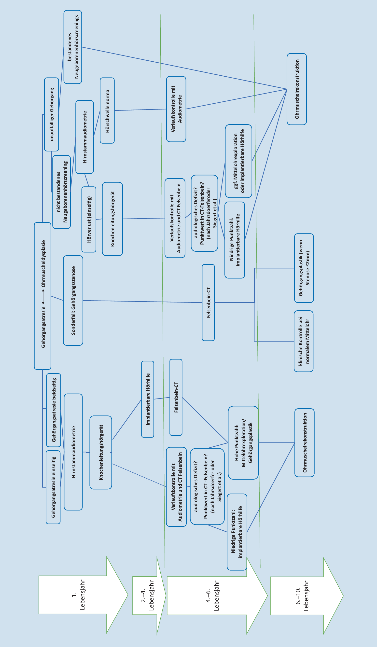 Grundsätzlich sollte die Diagnostik und Therapie an die individuellen Bedürfnisse der Patienten angepasst werden. Im Vorfeld kann man so auch auf die unterschiedlichen Erwartungshaltungen eingehen. Zum Überblick über die verschiedenen diagnostischen Maßnahmen kann ein Flussdiagramm hilfreich sein. Frenzel et al. entwarfen hierfür in der Vergangenheit das „Lübeck Flowchart for Functional and Aesthetic Rehabilitation of Aural Atresia and Microtia“ [28]. Dieses diente auch als Inspiration für eine etwas detailliertere Fassung (Abb. 10).