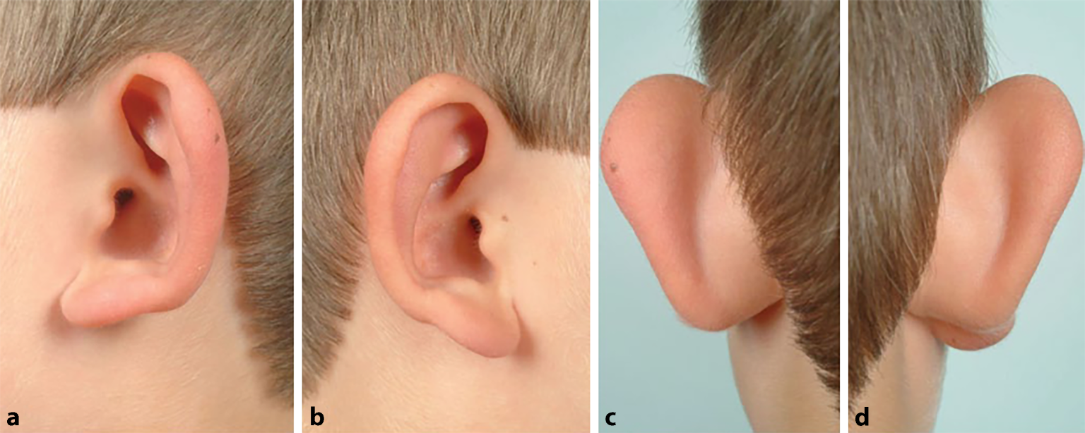 Patient mit Apostasis otis – in der Seitenansicht hypoplastische Anthelixfalte (a,b), Hyperplasie des Cavum conchae sowie Lobulushyperplasie. Von dorsal vergrößerter Winkel und Abstand zwischen Mastoid und Helix erkennbar (c,d). (Quelle: [15])
