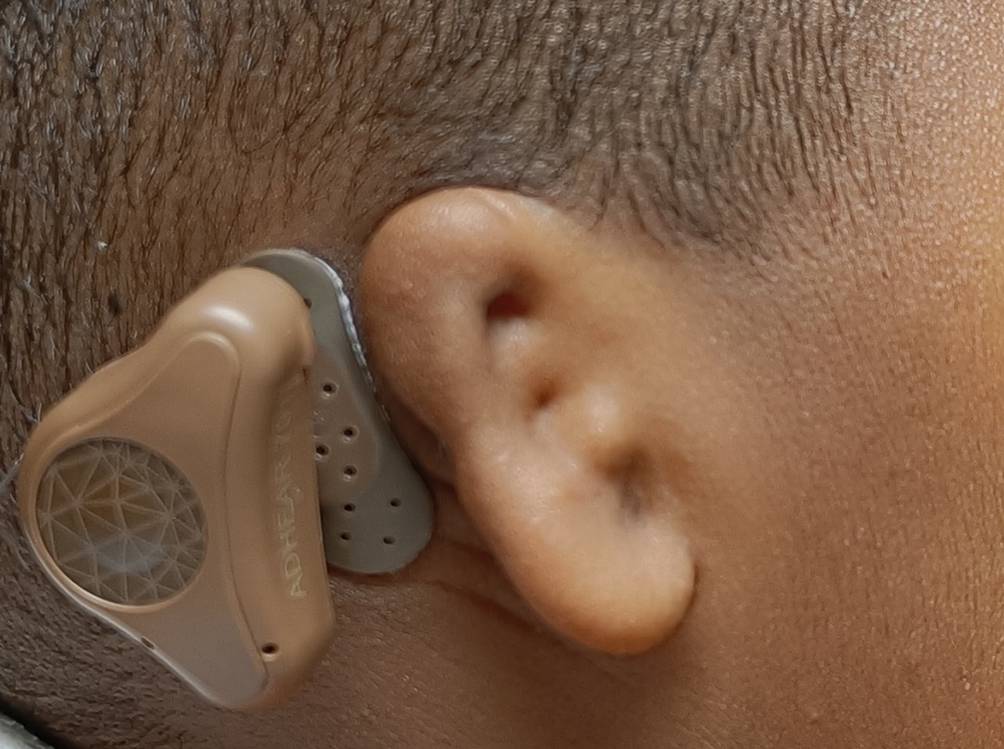 Ohrmuscheldysplasie Grad II–III (nach Weerda) – Versorgung mit Knochenleitungshörgerät bei Gehörgangsatresie – fehlende klassische Landmarken (wie beispielsweise Concha und Scapha). Externes Knochenleitungsgerät ebenfalls sichtbar. (Quelle: eigenes Bild des Autors)