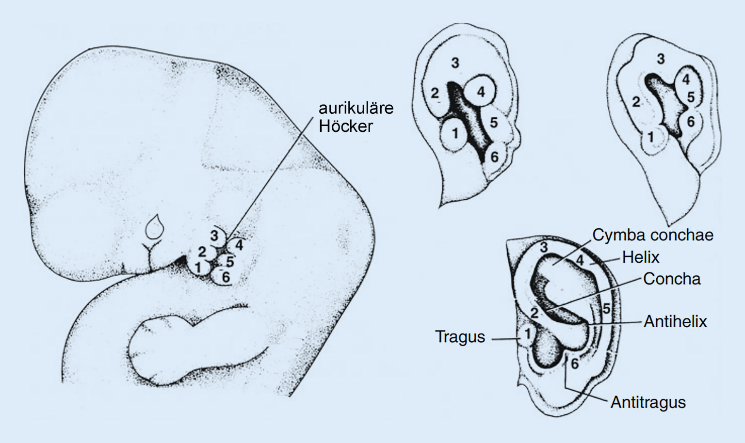 Die Ohrmuschel entsteht zwischen der 4. und 12. Gestationswoche aus mesenchymalem Gewebe des ersten und zweiten Kiemenbogens – den 6 Höckern von His (Abb. 6). Aus den ersten 3 Höckern entwickeln sich dabei der Tragus und die Crus helicis, aus den Höckern 4–6 der Lobulus, die Helix und die Anthelix. Eine sorgfältige Analyse einer Ohrmuschelfehlbildung lässt Rückschlüsse auf die beteiligten Höcker zu. Diesbezüglich sei auf eine Übersichtsarbeit von Bartels verwiesen [21]. Durch den Grad der Ohrmuscheldysplasie können Rückschlüsse auf den Zeitpunkt der Fehlentwicklung gezogen und somit andere Defizite vorausgesagt werden [7]. Bei Geburt weisen normal entwickelte Ohren etwa 2 Drittel ihrer endgültigen kraniokaudalen Länge und 76 % ihrer endgültigen anteroposterioren Breite auf [22].