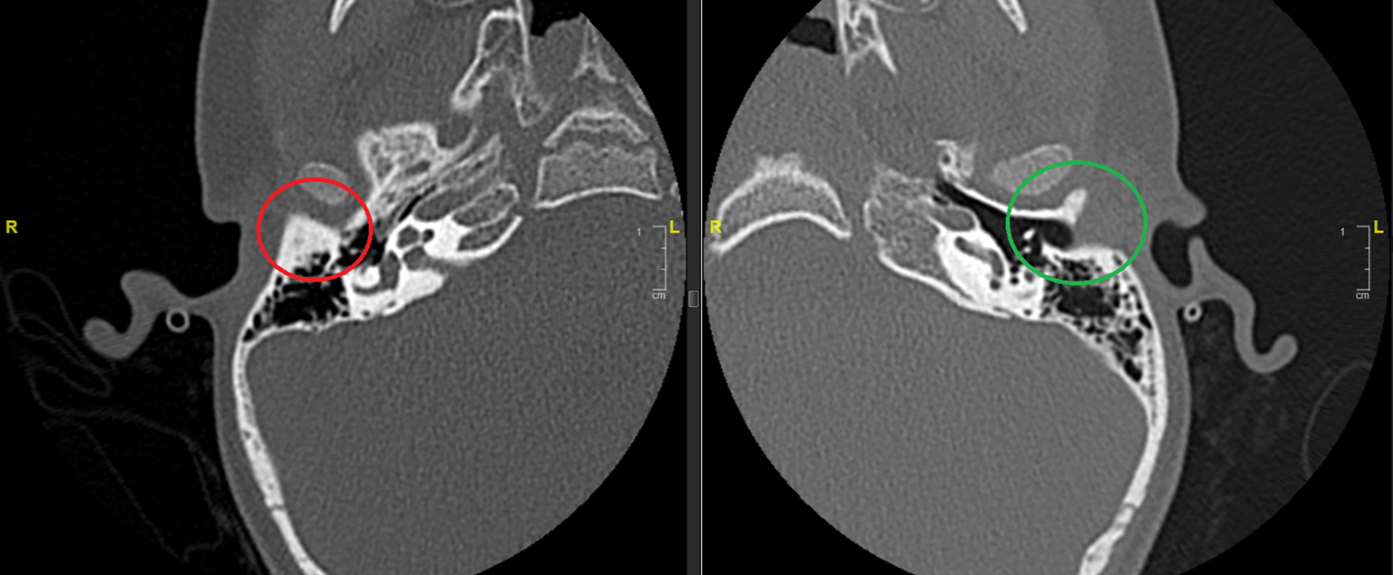 Axiale Schichten der Felsenbein-Computertomographie eines 6‑jährigen Patienten mit rechtsseitig nicht sondierbarem Gehörgangslumen, knöcherne Gehörgangsatresie (roter Kreis). Diesbezüglich Normalbefund auf der Gegenseite (grüner Kreis). (Quelle: eigenes Bild des Autors)