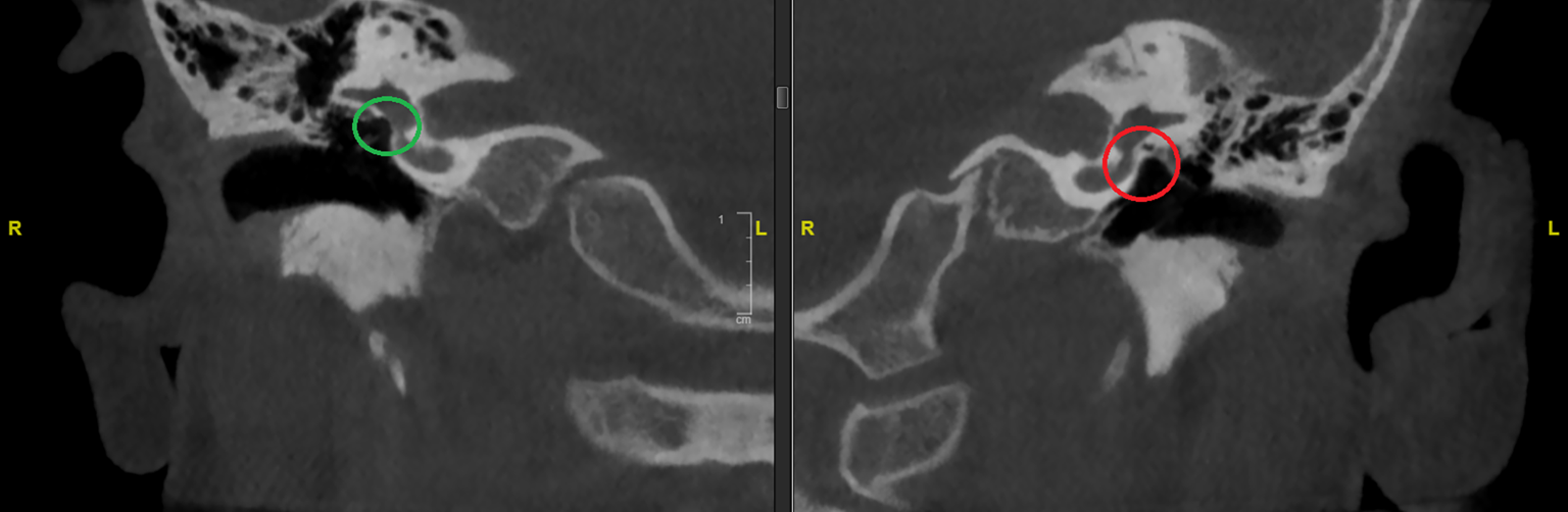 Koronare Schichten der Felsenbein-Computertomographie eines 7‑jährigen Patienten mit linksseitiger Ohrmuscheldysplasie Grad II nach Weerda, nicht angelegtes ovales Fenster (roter Kreis). Ovales Fenster der Gegenseite normal angelegt (grüner Kreis). (Quelle: eigenes Bild des Autors)