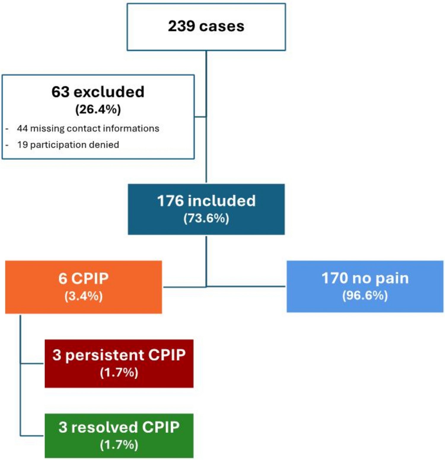 11]. However, in these studies, patients were followed-up after 16 to 50 years, a period after which pain may have been resolved. Accordingly, one study with a maximum follow-up period of 48 months reported a higher CPIP rate (5.1%) [