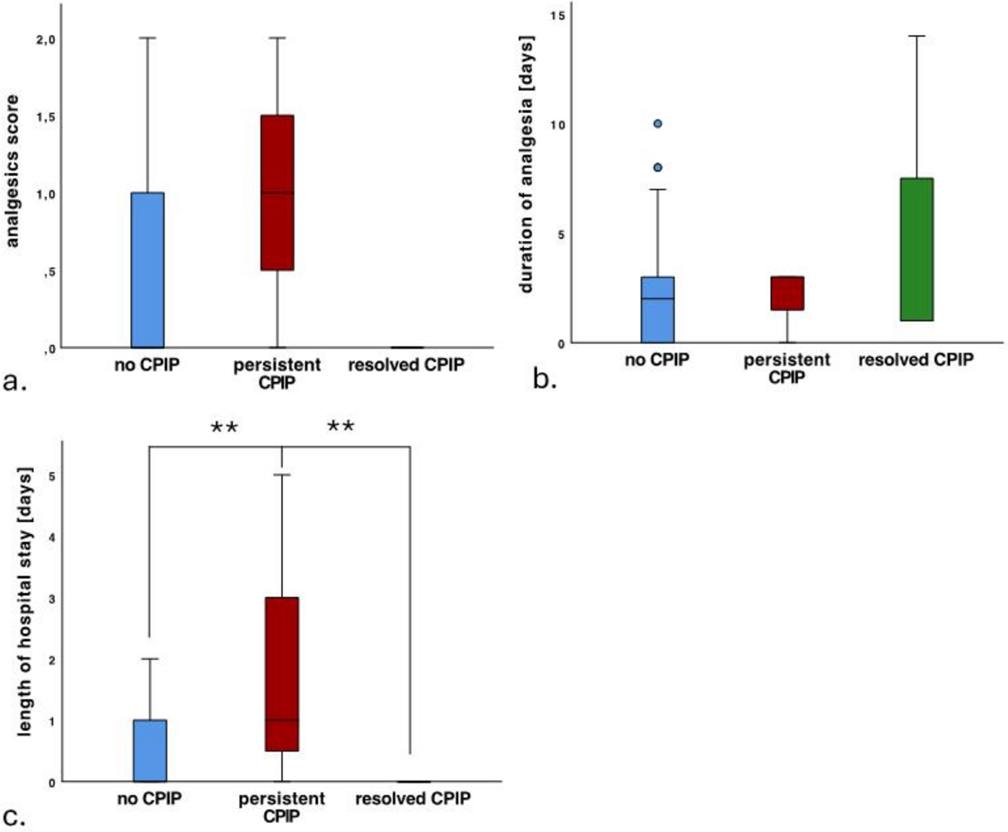 14]. As surgical treatment was usually performed on an outpatient basis, no information on type and dosage of analgesics after discharge could be obtained. An attempt close this gap by retrospectively interviewing the parents yielded fruitless, due to inaccuracies. A reliable statement can be made only about the duration of postoperative analgesia after discharge. In principle, patients who develop a CPIP have a longer duration of pain medication intake due to the longer-lasting postoperative pain. In our study cohort patients with rCPIP took pain medication for a significantly longer period postoperative than patients with pCPIP. The differences between rCPIP and pCPIP patients in the duration of use point towards a protective and resolving effect of adequate analgesia after discharge.