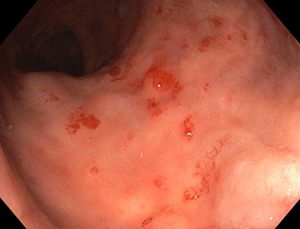 Eine durch CMV bedingte ulzeröse Entzündung am Magen-Darm-Trakt wird meist als opportunistische Erkrankung diagnostiziert, etwa als primäre oder reaktivierte Infektion bei Patienten mit HIV-Infektion, CED oder nach Transplantation [12]. Bei Immunkompetenz ist die Proktitis selten und meist mild und selbstlimitierend [13]. Sie kann mittels Polymerase-Kettenreaktion (PCR) und serologisch spezifiziert werden, am verlässlichsten aber immunhistochemisch bzw. histologisch (Eulenaugenzellen). Für die Therapie sind Virostatika wie Ganciclovir, Foscarnet oder Cidofovir empfohlen.