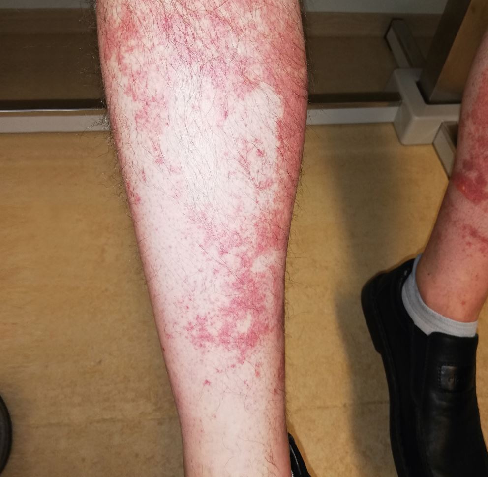 Ein 51-jähriger Mann stellte sich montagmorgens mit roten, punktförmigen Hautverfärbungen an beiden Unterschenkeln vor. Die Areale waren nicht erwärmt und juckten auch nicht. Auffällig war, dass sie direkt am Rand der Socken abrupt begrenzt waren. Wie der Tischtennis-Bezirksliga-Spieler berichtete, hatte er tags zuvor, an einem bis zu 35° C warmen Augustsonntag, eine Tageswanderung von rund 15 Kilometern Länge und 800 Höhenmetern unternommen.