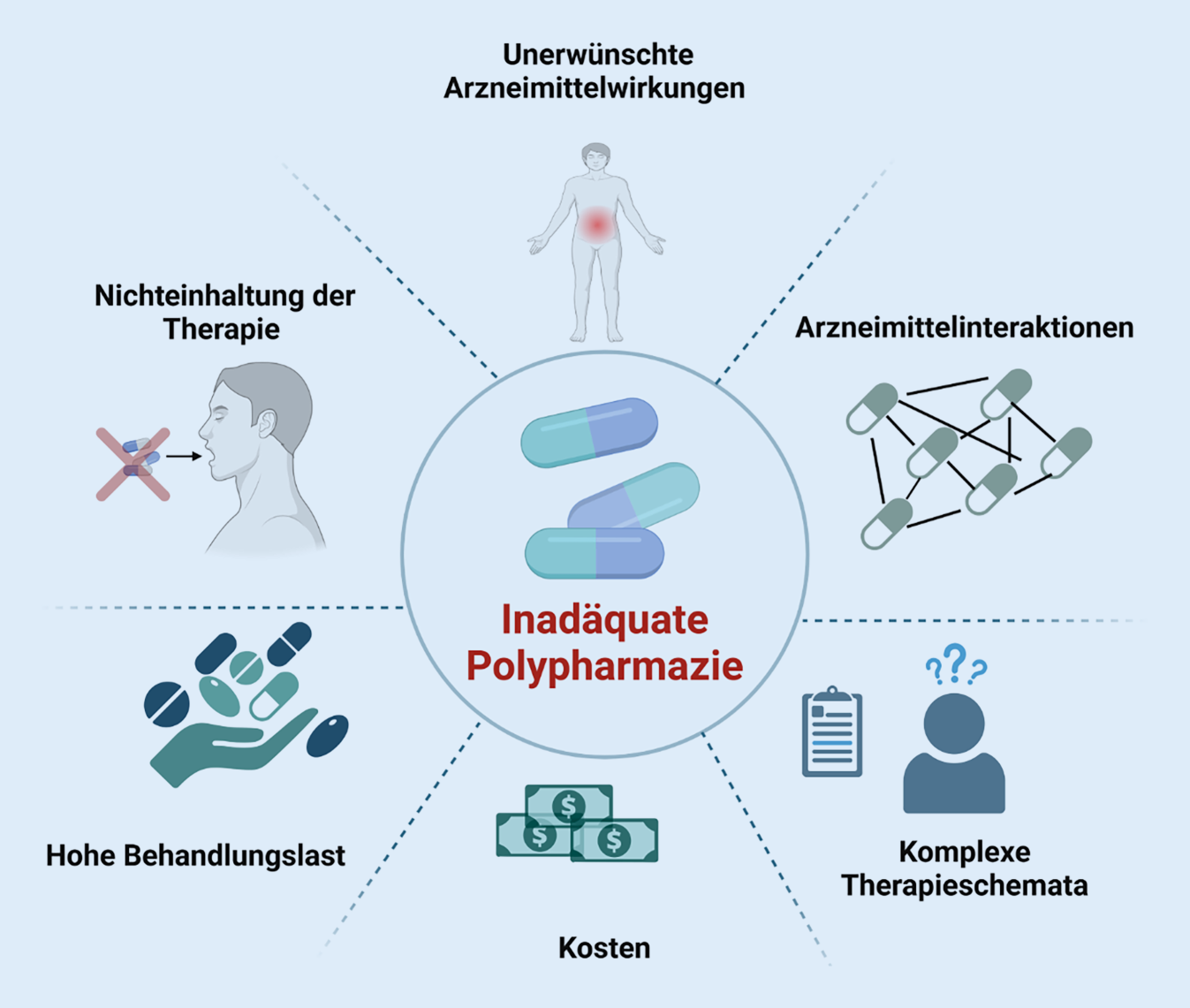 Inadäquate Polypharmazie führt zu Problemen wie vermehrten schweren Nebenwirkungen und Arzneimittelinteraktionen, komplexen Therapieschemata, hoher Medikamentenbelastung und einer häufigen Nichteinhaltung der Therapie.