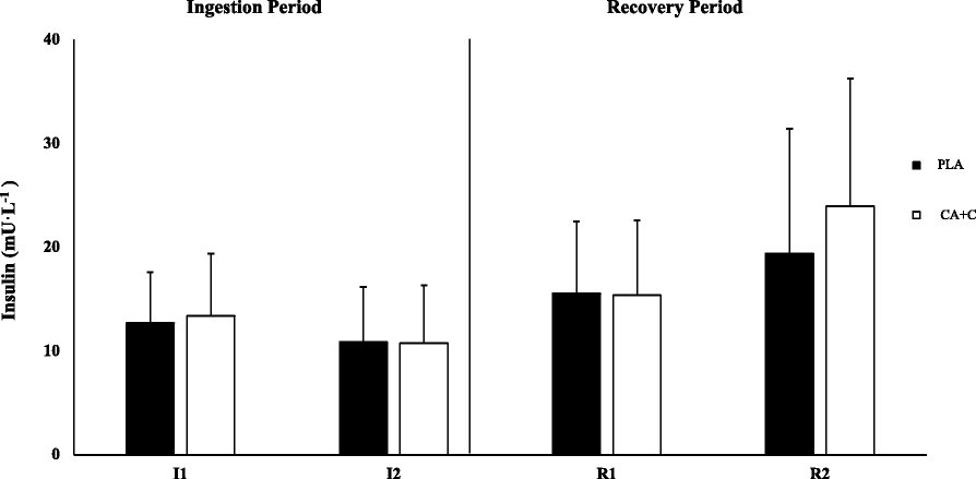 19]. The findings in our study are supportive of the expected response, with insulin concentration being maintained in both PLA and CA + C throughout the ingestion period. This is in contrast to Graham et al. [