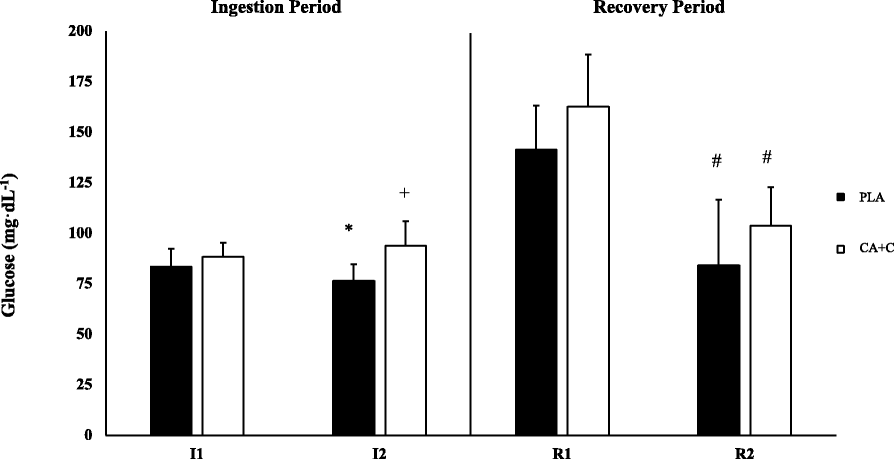 18]. Blood glucose concentration following the PLA trial is reflective of this response, with a significant drop occurring at I2. Interestingly, the CA + C ingestion period did not follow this trend. No changes in glucose concentration occurred and was found to be significantly higher than that of the PLA trial at the I2 time point. The glucose response following the CA + C trial is closer to those found by Ratamess et al. [
