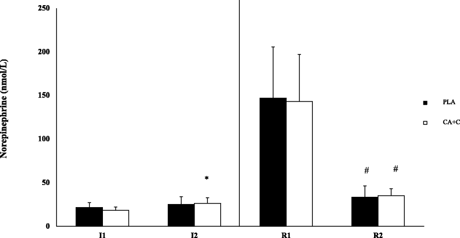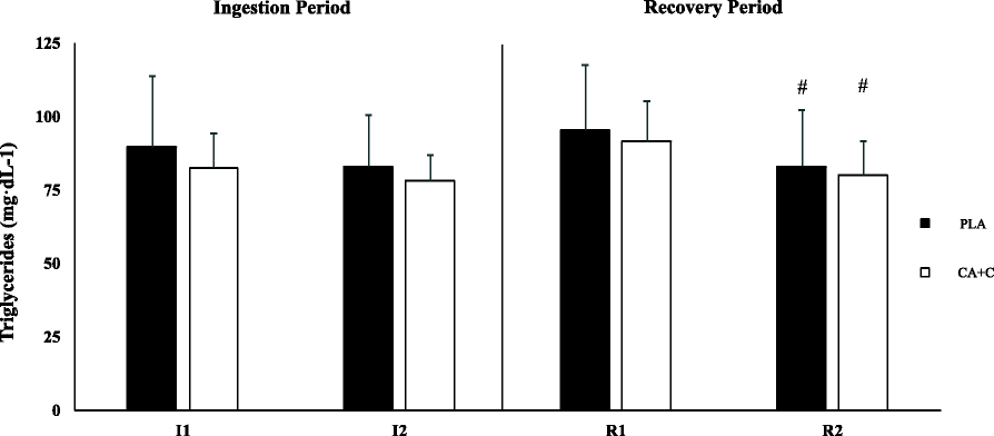 27], which is a beneficial response to high-intensity exercise. Interestingly, both trials showed spikes in plasma triglycerides at R1 when compared to I2, though no difference was observed between trials. Following the 45-min recovery, both trials demonstrate similar rates in recovery in triglycerides, suggesting that CA + C had no influence.