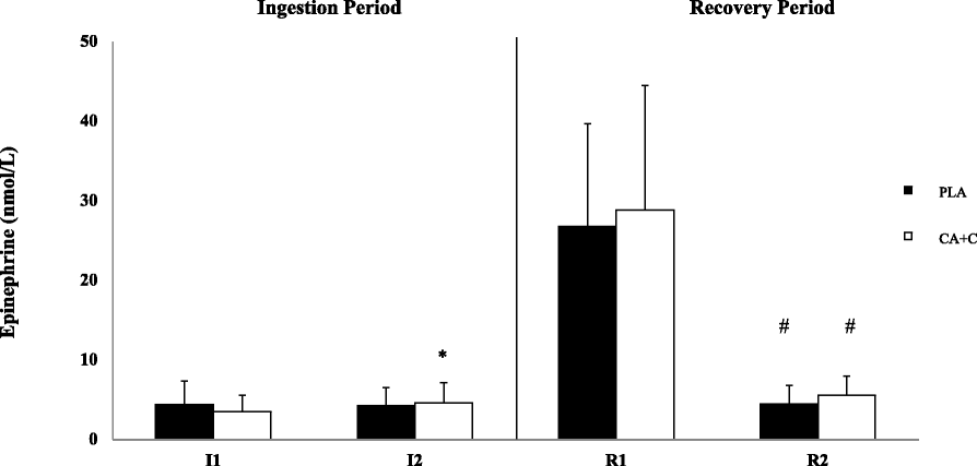 24], demonstrated a significantly higher level of plasma E 70-min following the consumption of 6 mg/kg of caffeine when compared to the placebo group. The caffeine concentration given in this trial was a single dose of 100 mg (1.13–1.44 mg/kg), which is far less than the examined dosages of the aforementioned studies. This may in part explain the modest increase in E and NE observed at I2 in the CA + C trial and consequent glucose maintenance as opposed to more robust glucose responses observed in other studies [