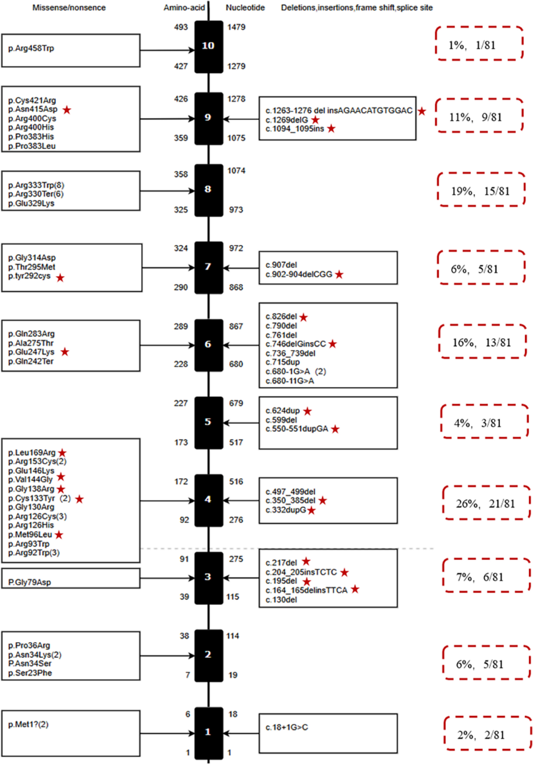The mutation distribution map of the SLC2A1 gene in Glut1DS patients is as follows: the black vertical line represents the SLC2A1 gene, with exons denoted by boxes. Missense and nonsense mutations are displayed to the left of each box, while frameshift mutations, in-frame insertions/deletions, and splice-site mutations are shown to the right. Numbers in parentheses indicate the number of patients harboring each specific mutation. Cases of multi-exon/single-exon deletions or whole-gene deletions (not shown) include eight instances of novel mutations. Asterisks highlight mutation sites that have not been previously reported in the literature