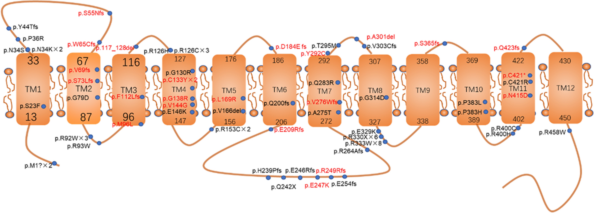 Distribution of SLC2A1 gene mutation sites on the GLUT1 protein. The map illustrates 57 mutation sites identified in 77 patients with Glut1 deficiency syndrome (Glut1DS). Mutations involving multi-exon/single-exon deletions, whole-gene deletions (nine cases), and intron mutations (four cases) are not displayed. Mutation sites marked in red indicate novel mutations unreported previously. Among the mutations, 44% (34/77) are located in intracellular regions, 31% (24/77) in transmembrane regions, and 25% (19/77) in extracellular regions
