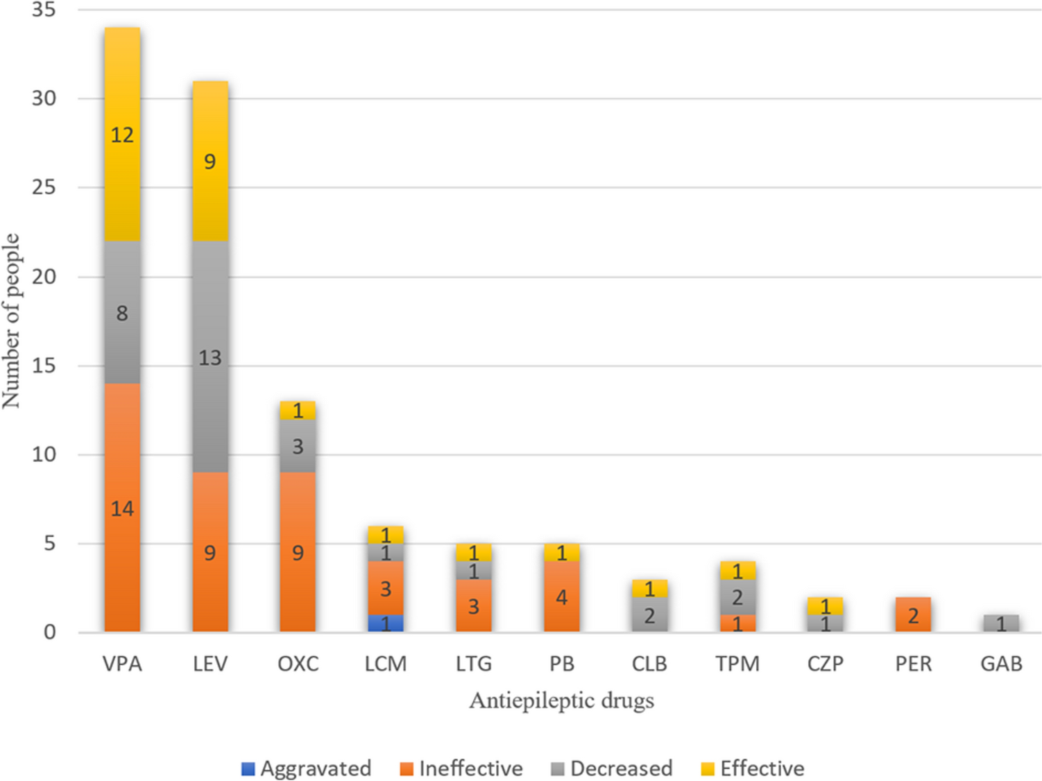 Efficacy of antiepileptic drugs (monotherapy/combination) in children with Glut1DS. VPA valproate, LEV levetiracetam, OXC oxcarbazepine, LCM lacosamide, LTG lamotrigine, PB phenobarbitone, CLB clobazam, TPM topiramate, CZP clonazepam, PER perampanel, GAB gabapentin