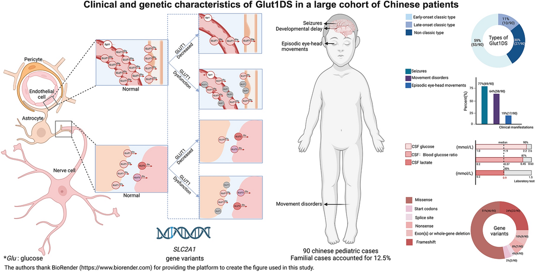 In conclusion, this study describes the phenotypic and genotypic characteristics of 90 patients with Glut1DS, expanding the clinical and genetic spectrum of the disorder. The ketogenic diet remains the first-line treatment and is generally well tolerated by patients. Early identification and diagnosis followed by the prompt initiation of a ketogenic diet can significantly improve prognosis. However, some children do not respond to the ketogenic diet, highlighting the need for further research into alternative therapies.