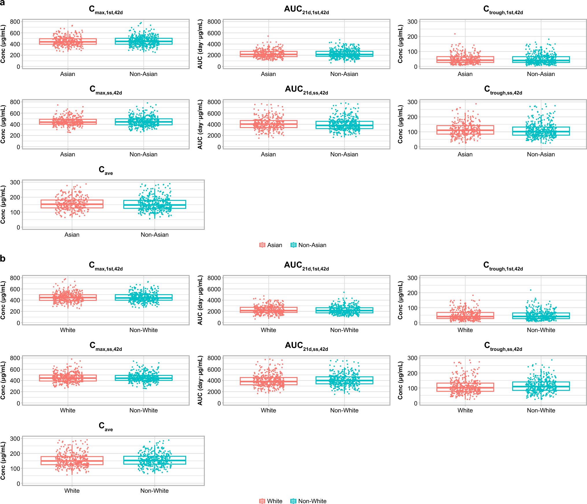 Zolbetuximab exposure metrics by ethnicity for Asian versus non-Asian (a) and White versus non-White (b) study participants. AUC area under the concentration-time curve, AUC21d,1st,42d area under the concentration-time curve from the time of dosing to 42 days after the first dose divided by 2, AUC21d,ss,42d area under the concentration-time curve from the time of dosing to 42 days after dosing at steady state divided by 2, Cave average concentration, Cmax,1st,42d maximum concentration during 42 days after the first dose, Cmax,ss,42d maximum concentration during 42 days at steady state, Conc concentration, Ctrough,1st,42d trough concentration during 42 days after the first dose, Ctrough,ss,42d trough concentration during 42 days at steady state