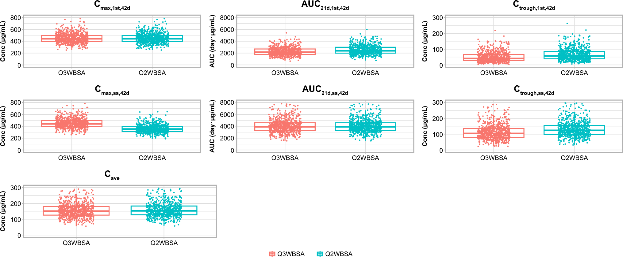 Simulated exposure metrics of zolbetuximab administered Q3W (800/600 mg/m2) or Q2W (800/400 mg/m2). AUC area under the concentration-time curve, AUC21d,1st,42d area under the concentration-time curve from the time of dosing to 42 days after the first dose divided by 2, AUC21d,ss,42d area under the concentration-time curve from the time of dosing to 42 days after dosing at steady state divided by 2, BSA body surface area, Cave average concentration, Cmax,1st,42d maximum concentration during 42 days after the first dose, Cmax,ss,42d maximum concentration during 42 days at steady state, Conc concentration, Ctrough,1st,42d trough concentration during 42 days after the first dose, Ctrough,ss,42d trough concentration during 42 days at steady state, Q2W every 2 weeks, Q2WBSA every 2 weeks dosing for the BSA-normalized regimen, Q3W every 3 weeks, Q3WBSA every 3 weeks dosing for the BSA-normalized regimen