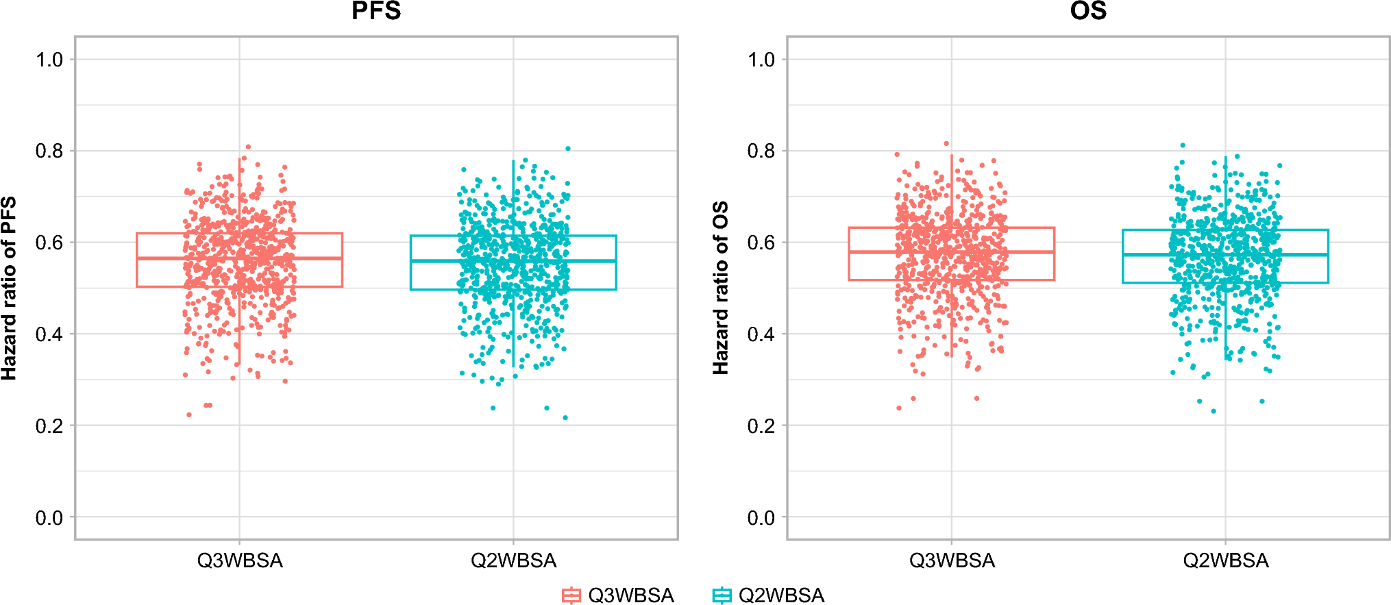 Model-estimated hazard ratios of PFS and OS: comparison of zolbetuximab 800/600 mg/m2 Q3W and 800/400 mg/m2 Q2W regimens. BSA body surface area, OS overall survival, PFS progression-free survival based on evaluation by independent review committee, Q2W every 2 weeks, Q2WBSA every 2 weeks dosing for the BSA-normalized regimen, Q3W every 3 weeks, Q3WBSA every 3 weeks dosing for the BSA-normalized regimen