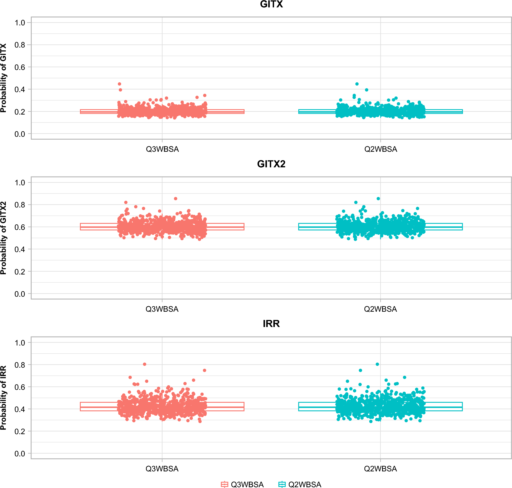 Model-estimated probabilities of toxicities: comparison between zolbetuximab 800/600 mg/m2 Q3W and 800/400 mg/m2 Q2W regimens. BSA body surface area, GITX combined gastrointestinal toxicity (nausea, vomiting, and abdominal pain) of grade ≥ 3, GITX2 combined gastrointestinal toxicity (nausea, vomiting, and abdominal pain) of grade ≥ 2, IRR infusion-related reaction flagged by investigator, Q2W every 2 weeks, Q2WBSA every 2 weeks dosing for the BSA-normalized regimen, Q3W every 3 weeks, Q3WBSA every 3 weeks dosing for the BSA-normalized regimen