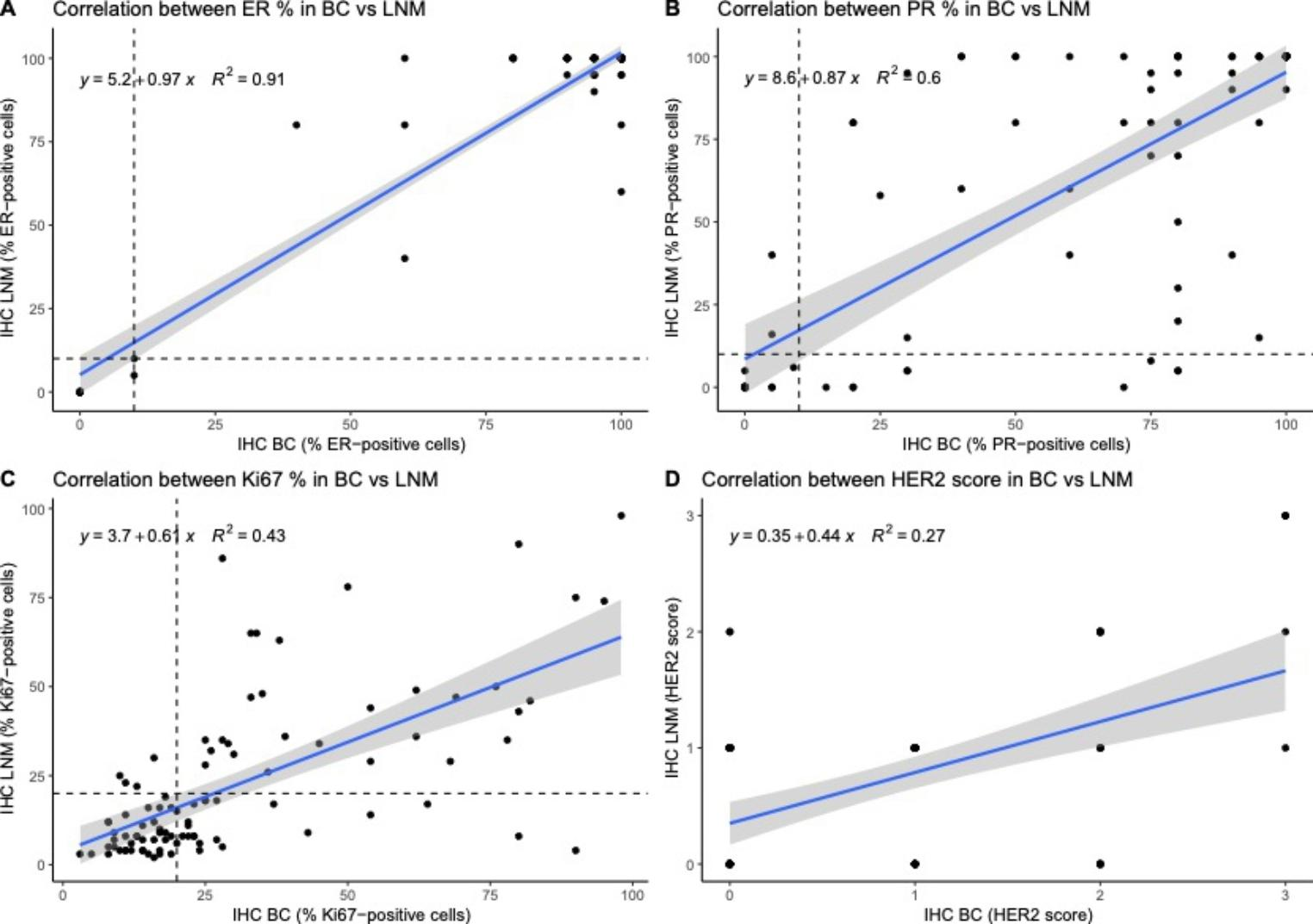 3]. In the event of LNM, treatment planning might be altered (e.g. surgery, hormonal therapy, chemotherapy, anti-HER2 treatment and radiotherapy). Studies have confirmed discordance between the primary BC and the LNM for individual biomarkers, as well as the surrogate subtypes. Discordance rates of 3–30% and 3–32% have been reported for ER and PR, respectively [