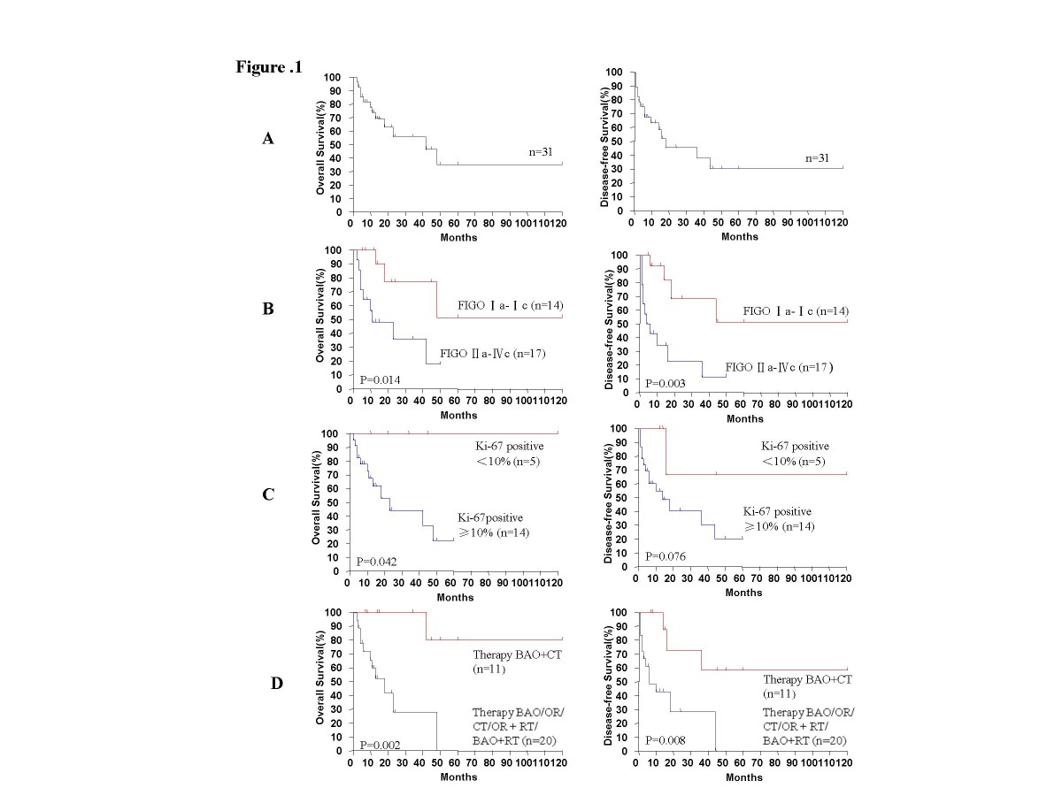 Cox proportional hazard regression analysis of patient survival based on clinical and pathologic factors was also performed. Multivariate analysis identified FIGO stage (Ia- Ic vs. IIa- IIIc, Hazard Ratio (HR) = 0.231, 95% CI of ratio = [0.072, 0.743], P = 0.007) and treatment (BAO/OR/CT/OR + RT/BAO+RT vs. BAO+CT, HR = 6.516, 95% CI of ratio = [1.974, 21.52], P = 0.008) to be significant independent prognostic factors for survival. In contrast, patient age, tumor size, mitosis events per 10 HPFs, and percentage of Ki-67-positive cells present were not found to be significant independent prognostic factors for survival (Table 2).
