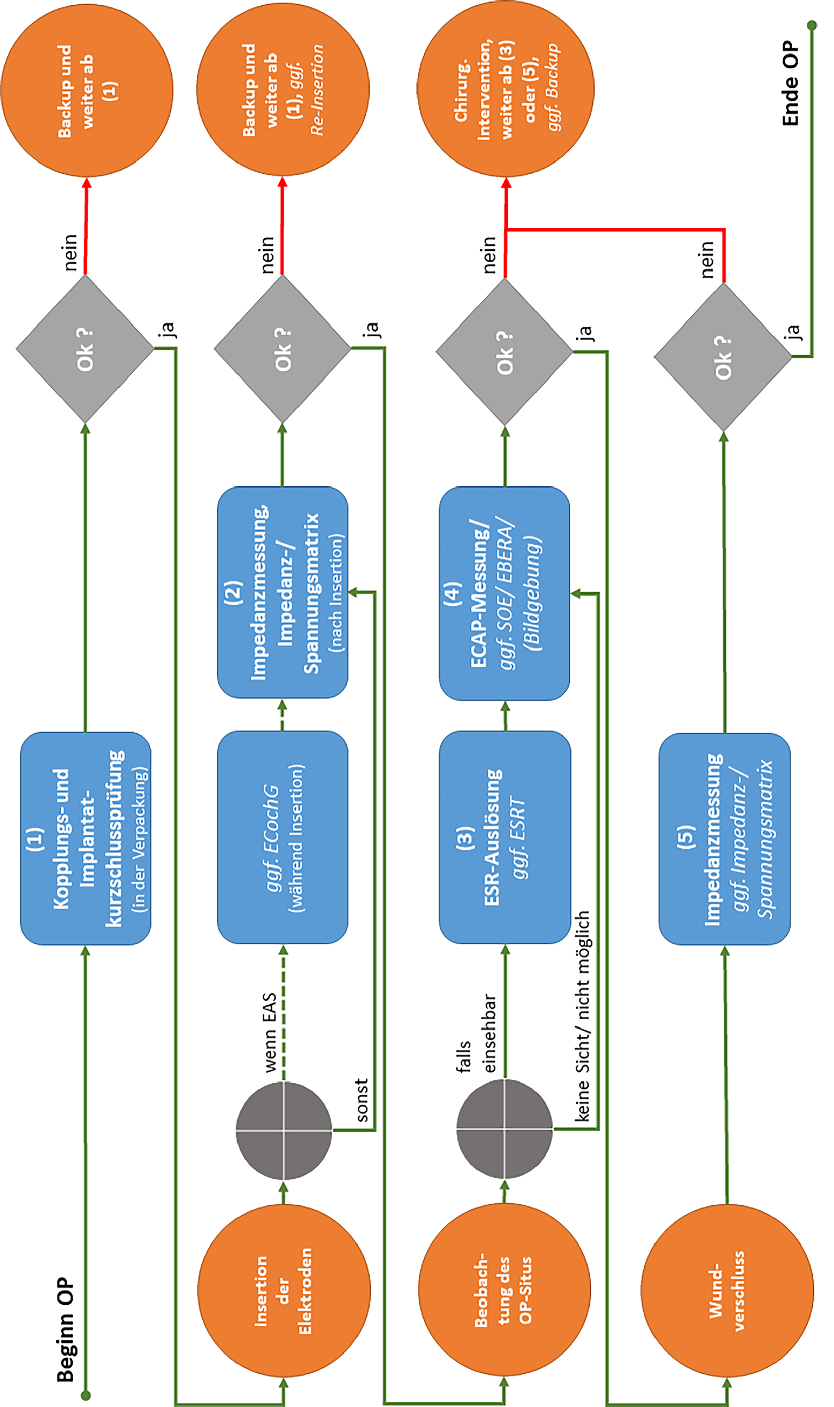 Kopplungs- und Implantatkurzschlussprüfung | – Prüfung auf bidirektionale telemetrische Datenübertragung – Kontrolle der spezifikationsgerechten Funktion des Implantats inkl. der Elektrodenkontakte – Hinweise auf Defekte des Implantats | Spulen-Implantat-Kopplung [ja/nein] Impedanzen [Z in kΩ] | Messung in allen verfügbaren Stimulationsmodi an allen Elektrodenkontakten des Implantats präOP: vor Beginn der Operation in der sterilen Verpackung (alternativ: Überprüfung in NaCl-Lösung direkt vor Insertion) intra-/postOP: Monitoring der Kopplung während der gesamten audiologisch-technischen Diagnostik | (1) stabile Kopplung und bidirektionale Datenübertragung (2) keine Kurzschlüsse zwischen den Elektrodenkontakten |