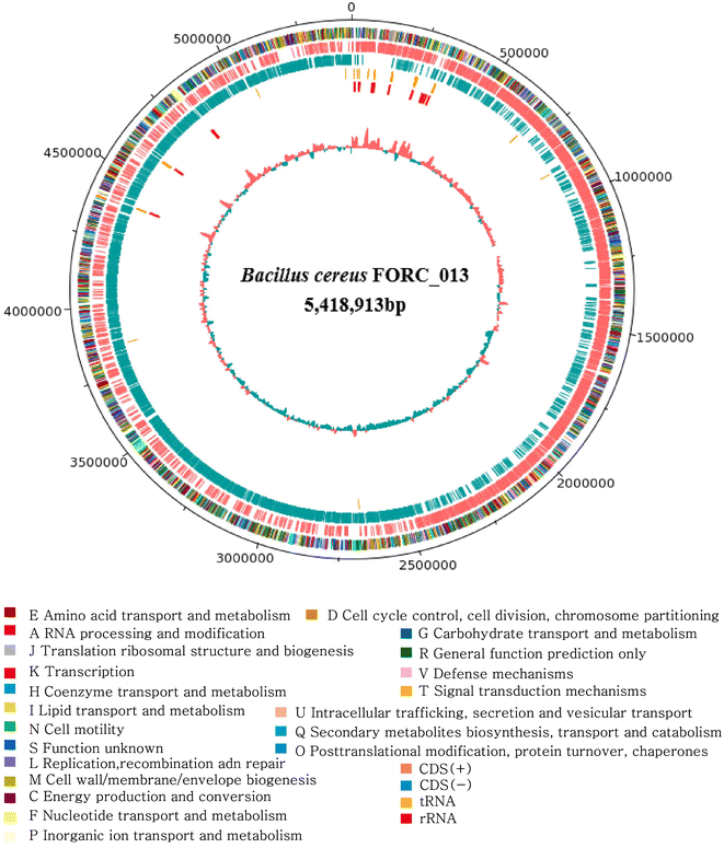 1). The virulence factors of FORC_013 were classified into six categories: host immune evasion, lipase, protease, regulation, toxin, and others. As previous studies reported, the diarrheal symptom is well known for having a close relationship with the enterotoxin, such as hemolytic enterotoxin HBL, non-hemolytic enterotoxin NHE and cytotoxin K [