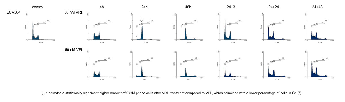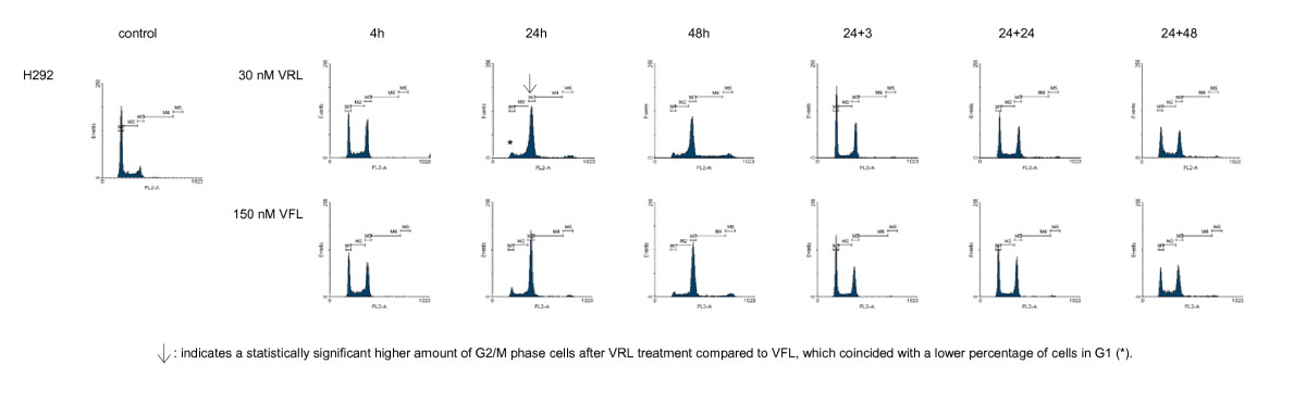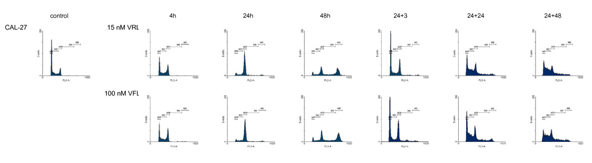 - Secondly, the cell cycle was investigated over time (cell cycle kinetics). For these experiments, not only different incubation times were investigated (4 – 48 h), but also different time points after a 24 h incubation (3 – 72 h). Therefore cells were treated during 24 h with VRL or VFL and cell cycle analysis was performed 0, 3, 24, 48 or 72 h after drug wash out (indicated as 24+0, 24+3, 24+24, 24+48, 24+72, respectively). The concentrations used for this second set of experiments were identical to those resulting in a clear G2/M block in the first set of experiments with VFL, and their equitoxic VRL concentrations, i.e. 30 nM VRL/150 nM VFL for ECV304 and H292, 15 nM VRL/150 nM VFL for MCF-7 and 15 nM VRL/100 nM VFL for CAL-27 cells.