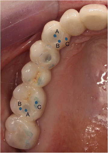 For each access-hole, the contact patterns of antagonistic cusp in the centric occlusion were recorded intra-orally. They included; A: contact in the center, B: contact on the border of the access-hole and C: no contact close to the border (Fig. 2). At the time of the restoration (T = 0), followed by 1, 3, 6, and 12 months (T = 1, 3, 6, and 12 M), impressions were taken with polysiloxane impression materials (President, Light Body, (lot: G01914), Soft Putty (lot: G08568), Coltène/Whaledent AG, Switzerland) in a double mixed method. Epoxy casts (Devcon ET, Lot: 350402, ITW PP&F, Japan) were made from these impressions, and the fillings were examined using a motorized digital microscope (DSX510, Olympus KeyMed Ltd, USA) with a 1 μm accuracy under ×30 digital magnification.