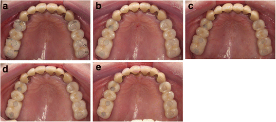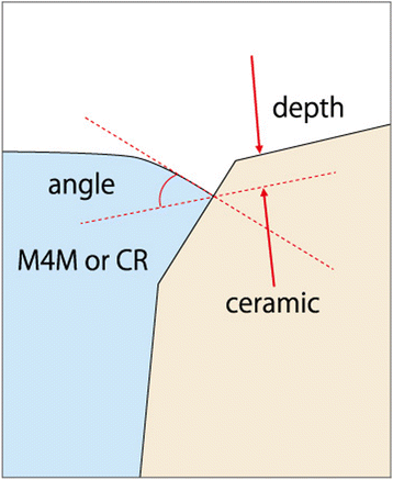 The marginal depth of the access-hole filling at T = 0, T = 1 M, T = 3 M, and T = 6 M could not be defined successfully because of the overfilling phenomenon which disrupted the measurement of marginal gap depth and angle (Fig. 3a–e). Only the marginal depth and angle at T = 12 M could be measured with the same digital microscope, and the mean value for each group was calculated. Each access-hole was divided into four areas including mesio-buccal, disto-buccal, mesio-palatal and disto-palatal surfaces (Fig. 4) to measure the distance of marginal discrepancy at resin/ceramic interface with a 1 μm accuracy (Fig. 5). With this value, a “marginal discrepancy pattern” could be extrapolated for each group (Fig. 7a, b).