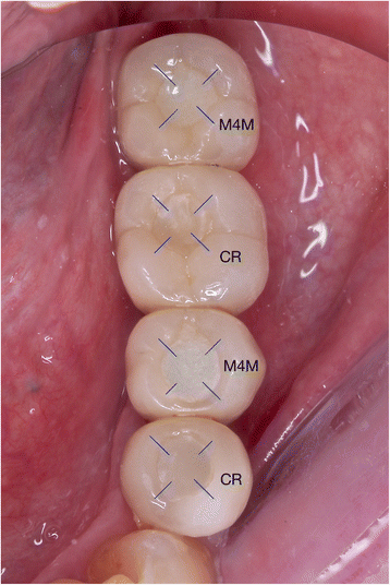 In this context, access-hole filling is a common clinical procedure, but studies are quite limited in the literature. Photo-polymerizing resin composites have been widely used to fill the ceramic access holes, but unfortunately, the prognoses were less favorable [21‐23]. The use of an efficient ceramic primer (CP) containing phosphoric acid monomer is mandatory to ensure durable adhesion to the feldspathic ceramic surface [24, 25]. In the previous in vitro study [12], ceramic access-hole specimens filled without ceramic pre-treatment showed no bond strength regardless of the use of the bonding agent. For this reason, in this in vivo study, the CP was used for groups CR and M4M.