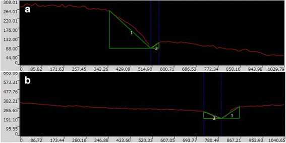 a, b (The marginal discrepancy pattern for group CR and M4M). a Group CR (1: Ceramic surface, 2: CR surface) Units of the axis are in μm. b Group M4M (1: Ceramic surface, 2: M4M surface) Units of the axis are in μm