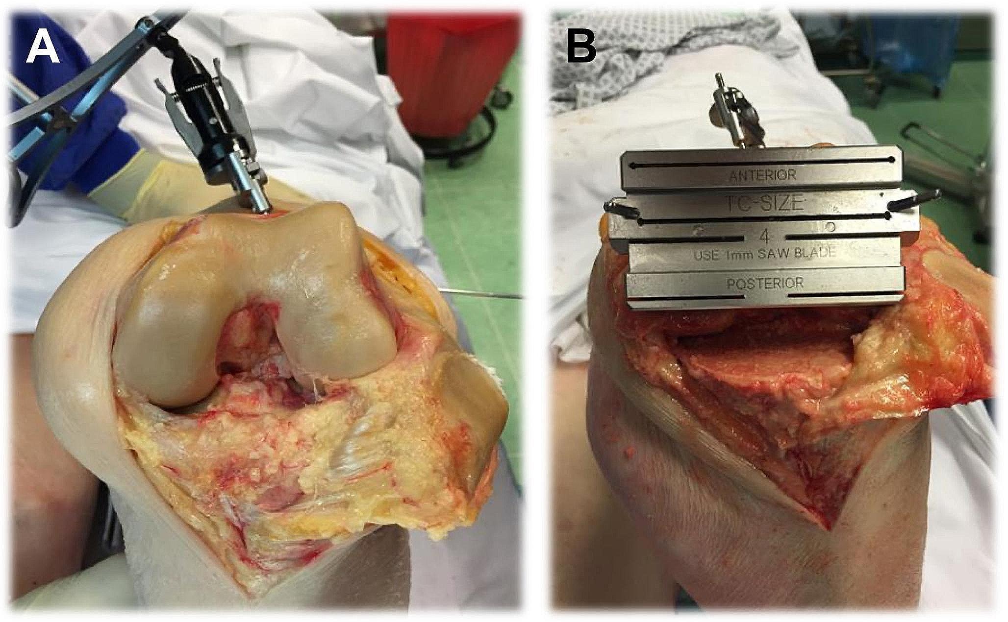 Cadaver preparation. (A) Femoral condyles after resection of the anterior cruciate ligament, note incision of the femoral reference locator in the upper image section. (B) Attached four-in-one saw block