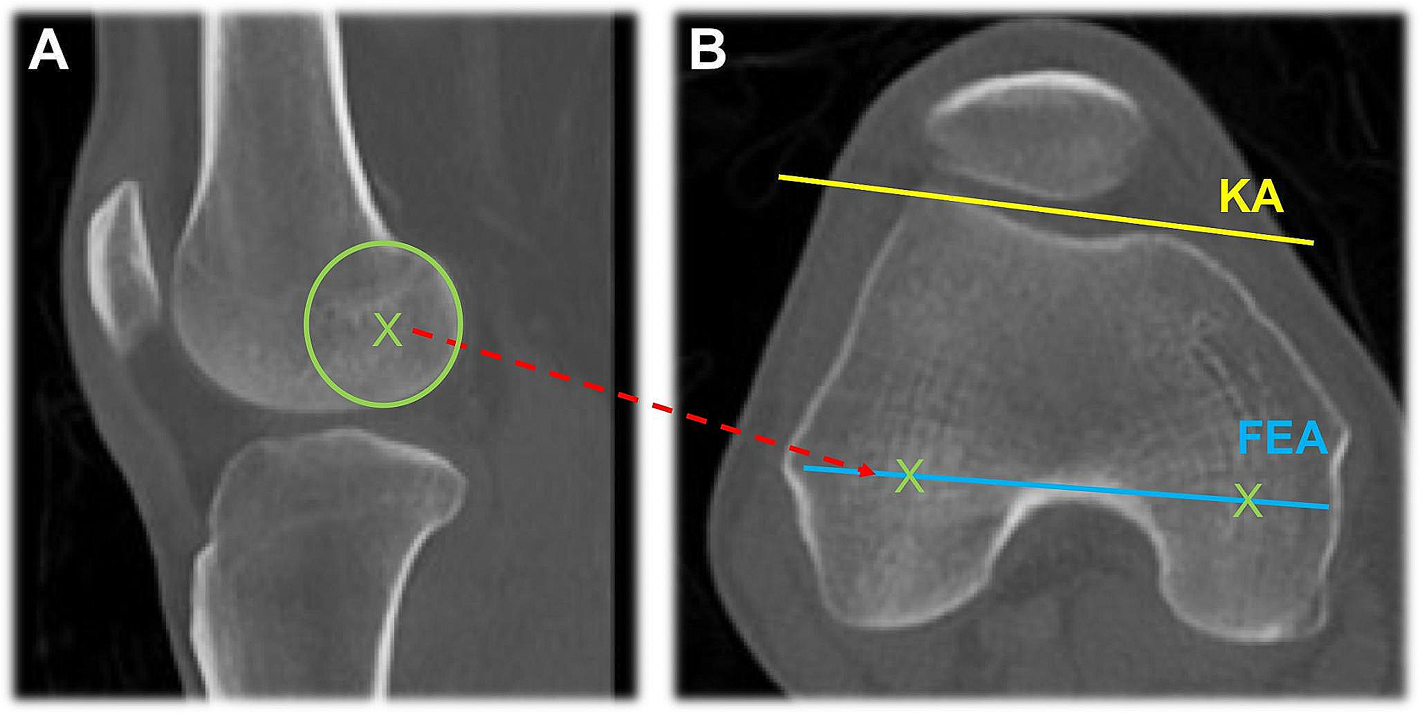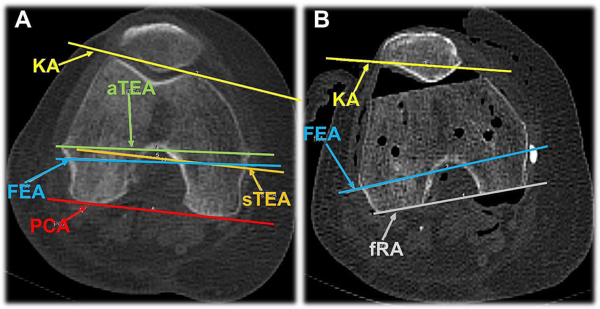 Our study suggests that the sTEA is characterized by a quite reliable determinant based on CT diagnostics. Based on these results of our study, the use of sTEA for femoral rotational alignment based on CT diagnostics can indeed be recommended. The development of surgical methods for reliable intraoperative detection of sTEA would be highly meaningful for clinical application. Large differences in rotational positioning of the femoral component, such as extreme external rotation positioning, occurred during alignment using aTEA. In our study, the aTEA of 5.2° (± 4.5) also showed a statistically significant absolute deviation from the FEA (p*** < 0.0001). This was the largest deviation when compared to the other axes. The results of our study are in accordance with the results obtained in the study of Kumar and Sharma (2018) [24]. In clinical application, the difficulty of reliable intraoperative detection of the bony reference points is therefore to be considered, since the clinically relevant femoral malrotations, as obtained with sTEA are expected. For this reason, aTEA can definitely not be recommended as a reliable reference point in primary total knee arthroplasty. Thus, the development of improved techniques for intraoperative determination is essential. In revision arthroplasty, however, aTEA and sTEA consolidate their position in the absence of applicability of other axes. As an alternative to femoral intraoperative rotational alignment, a ligament tension-adapted technique has been described [8]. With this technique, femoral rotation is determined by a ligament tensioner with reference to the tibial saw cut to create a parallel, ligament-balanced flexion gap. Here, we describe a specific ligament tension and rotational orientation parallel to the tibial saw cut compared to the traditional bony landmarks. This investigated feature of the FEA reconstruction achieves similar results when compared to the known equivalent axes.