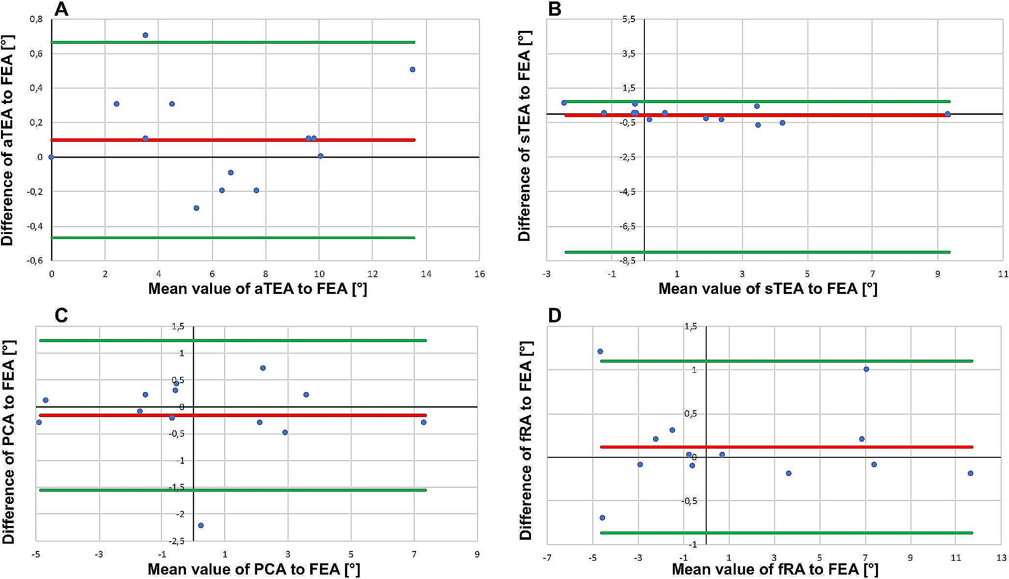 The Bland-Altman plots show a distribution of values within the fluctuation range, with the exception of a few outliers (see Fig. 4A-D). The interrater reliability was also calculated and resulted in a Cohen’s Kappa value of 0.591 for the comparison of the fRA to the FEA. This result indicates a moderate agreement between the measured values. For aTEA/FEA the Cohen’s Kappa κ value was 0.471 and thus, there is again a moderate agreement, whereas sTEA/FEA show a value of 0.191 and for PCA/FEA it was 0.189, which represents a low agreement.