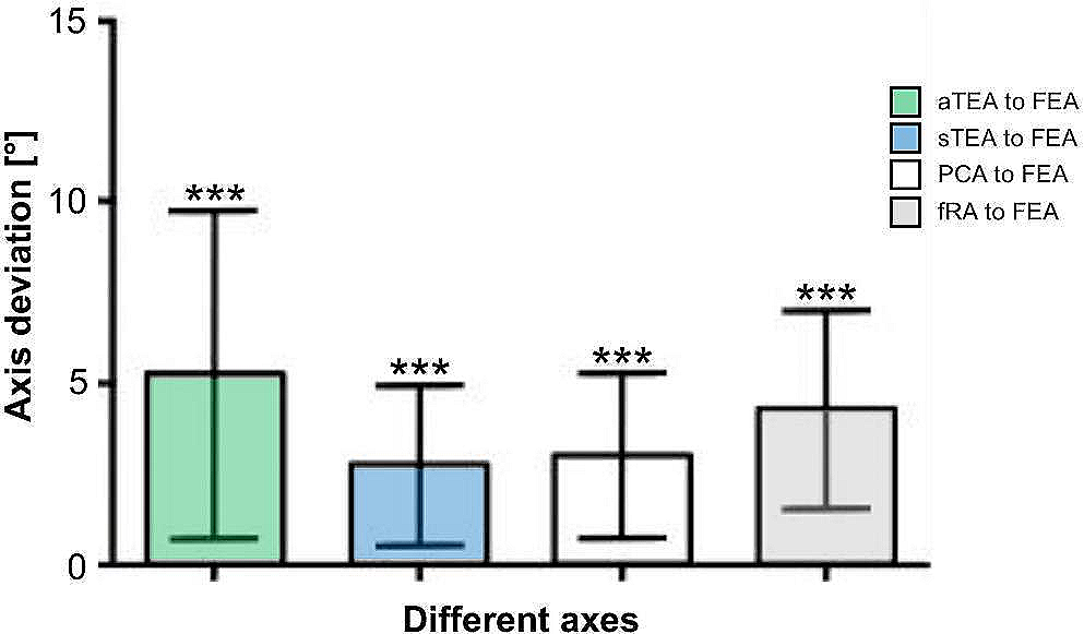 The statistical evaluation showed a significant angular deviation in external direction for all axes (p*** < 0.0001) in reference to FEA. In case of aTEA an absolute mean angular deviation of 5.2° (± 4.5) was found, in case of sTEA the deviation was 2.7° (± 2.2), with PCA 2.9° (± 2.3) and, finally, the deviation of fRA was 4.3° (± 2.7) (see Fig. 5).