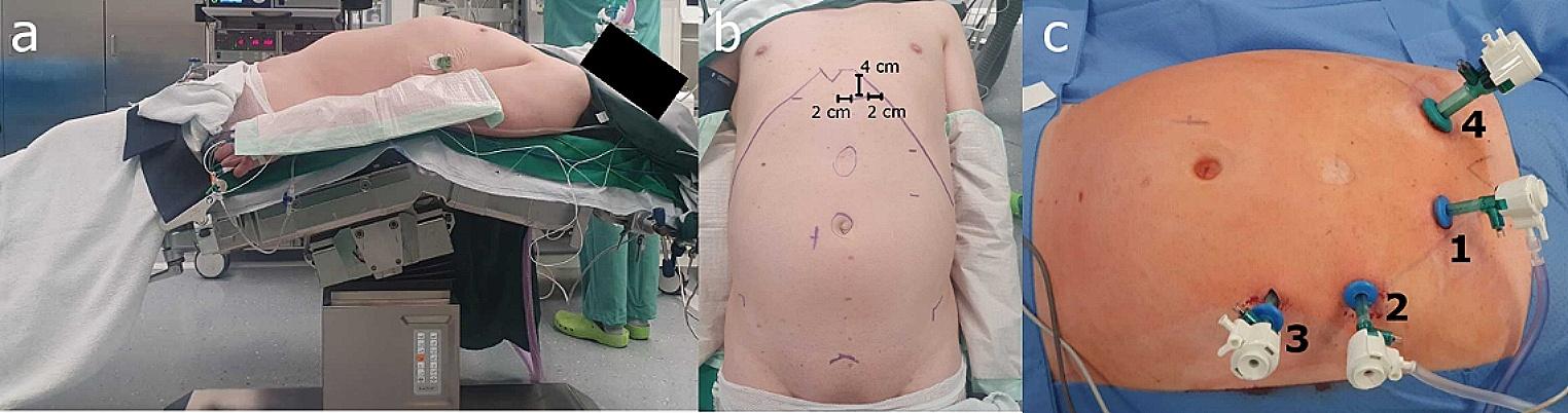 (a) Positioning of a patient; (b) Preoperative markings; (c) Trocars labelled according to order of introduction