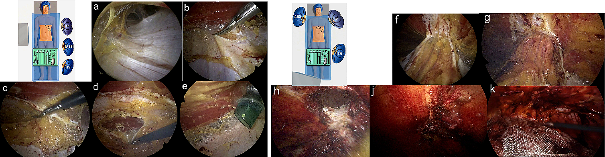 (a) Blunt dissection in the retromuscular space; (b) Identification and transection of the posterior fascial layer on the left side; (c) Preperitoneal dissection behind the linea alba; (d) Visualisation of the contralateral posterior fascial layer and transection; opening of the right-sided retromuscular space; (e) Placement of a camera trocar in the right retro-muscular space; (f) Cranio-caudal view depicting both retro-muscular spaces as well as the preperitoneal space; (g) Cranial depiction of the hernia defect; (h) Repositioning of the hernia sac along with its content; (j) Continuous closure of the hernia defect (k) Placement of the mesh