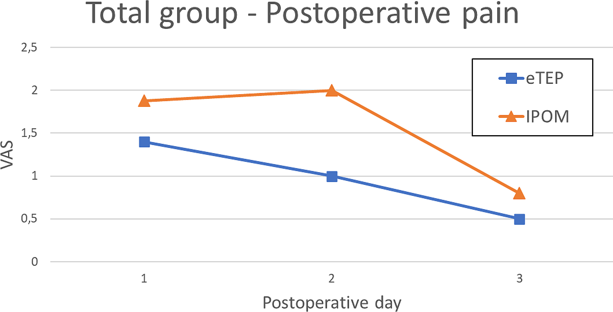 The postoperative pain was lower in the eTEP group, although without statistical significance. A slight increase in pain on postoperative day two was noted in the IPOM patients, similar to the trend in the total group analysis (Fig. 5).