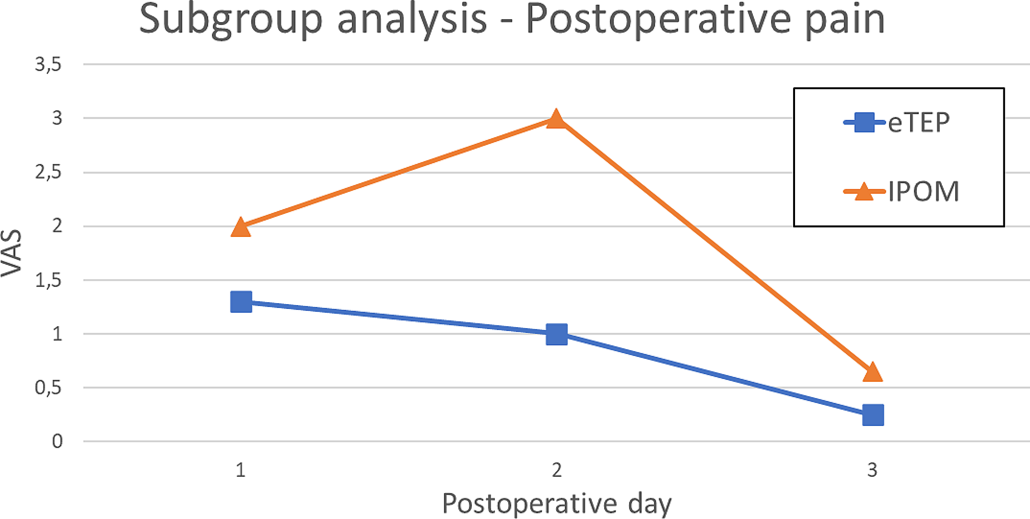 VAS for postoperative days 1–3 for the eTEP and IPOM group in the subgroup analysis
