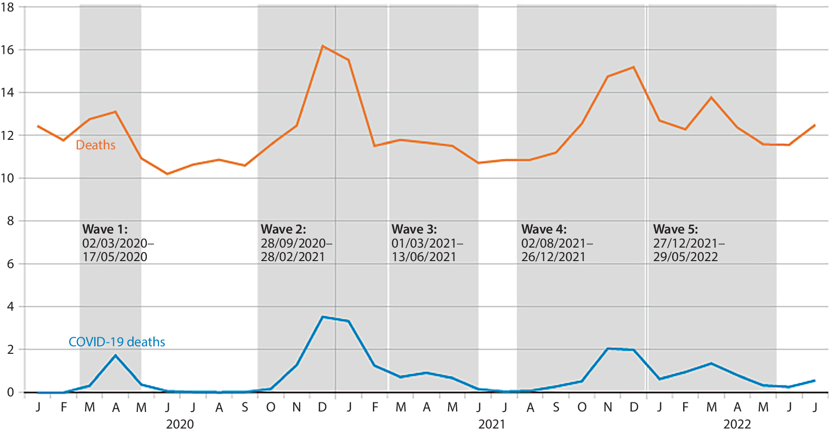 In December 2020 and January 2021, the highest numbers of monthly COVID-19 deaths occurred. During this time period, a total of 3531 and 3329 people, respectively, died due to COVID-19 (almost 22% of monthly deaths; Fig. 1). High numbers of COVID-19 fatalities were also recorded at the end of 2021, with 2048 deaths in November and 1988 in December (13.9% and 13.1% of monthly deaths, respectively).