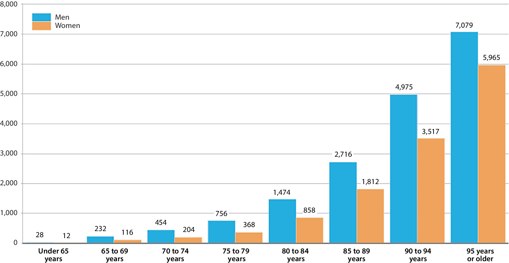 Those who died of COVID-19 were on average 81.2 years old (standard deviation [SD]: 11.1) and significantly older (t-test: p < 0.0001) than others who died of nonexternal causes (mean: 79.5 years; SD: 13.0). Men who died of COVID-19 were on average 78.9 years old (median: 81; SD: 11.2), while women were significantly older at an average of 83.7 years (median: 85; SD: 10.3).