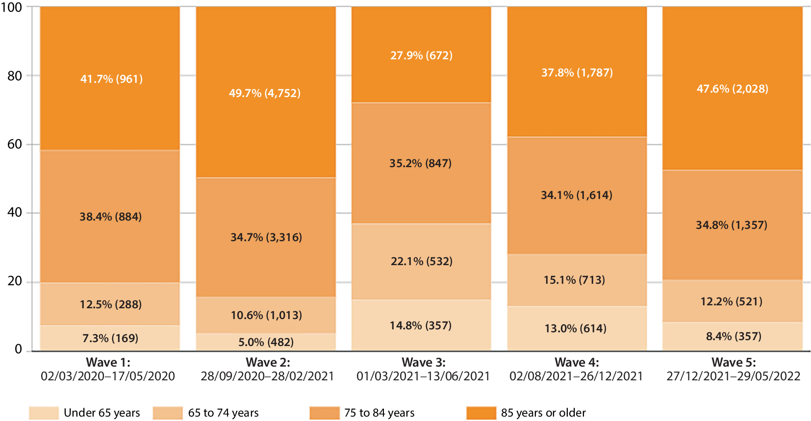 A wave-specific examination of the age distribution revealed clear differences between the phases of the pandemic. For example, the proportions of COVID-19 deaths in individuals aged 85 years or older in waves one (41.7%), two (49.7%), and five (47.6%) were significantly higher than in waves three (27.9%) and four (37.8%). Accordingly, the third and fourth waves were characterised by higher proportions of younger deceased (Fig. 3).