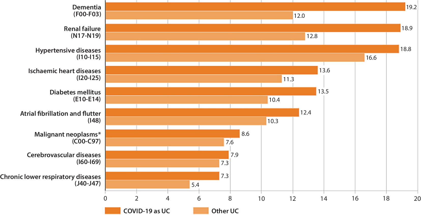 Most frequent comorbidities and previous diseases of persons ≥ 65 years with underlying cause (UC) COVID-19 compared to other nonexternal causes of death between March 2020 and July 2022 in Bavaria (in percent) according to the official cause of death statistics. Asterisk indicates lack of secondary neoplasm. Source: own figure.