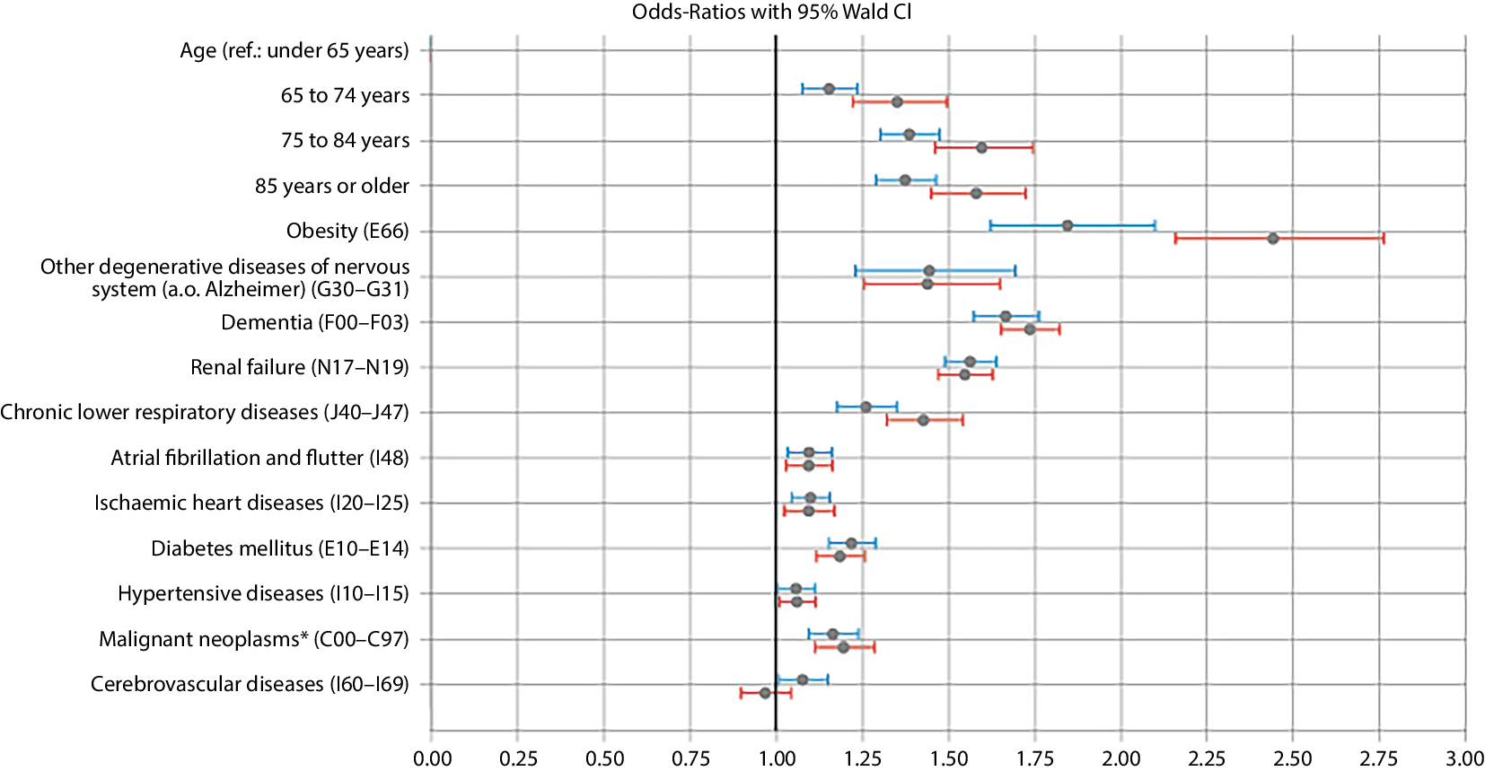 Mutually adjusted odds ratios with 95% confidence intervals for dying from COVID-19 compared to dying from another nonexternal cause of death for men (blue) and women (red) in Bavaria (March 2020—July 2022) according to the official cause of death statistics. Asterisk indicates lack of secondary neoplasm. Source: own figure